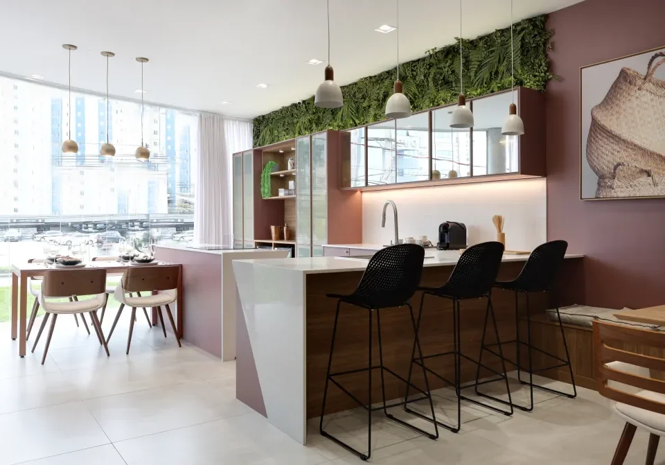 Na cozinha, o aproveitamento do espaço vertical é essencial. Armários altos e o uso de organizadores dentro dos armários podem maximizar o armazenamento sem comprometer a funcionalidade.